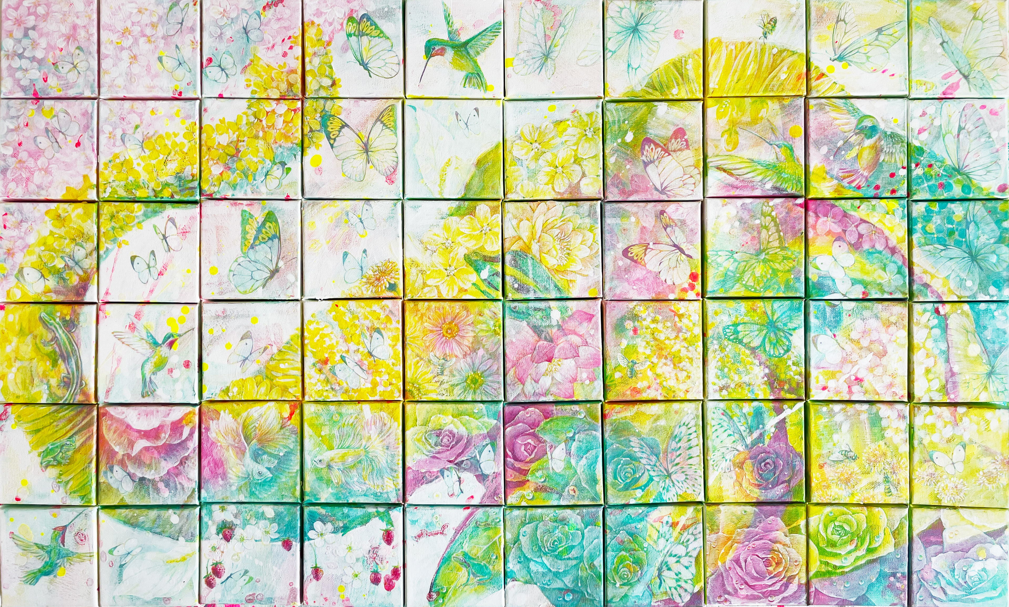 パーティーアートは、それぞれ違った物語の小さな作品(10×10×3cm)を組み合わせて大きな絵を描いた、個性あるパート(PART 一部)が集まると 楽しいパーティ(PARTY 団体)になるということを表現した作品です。
