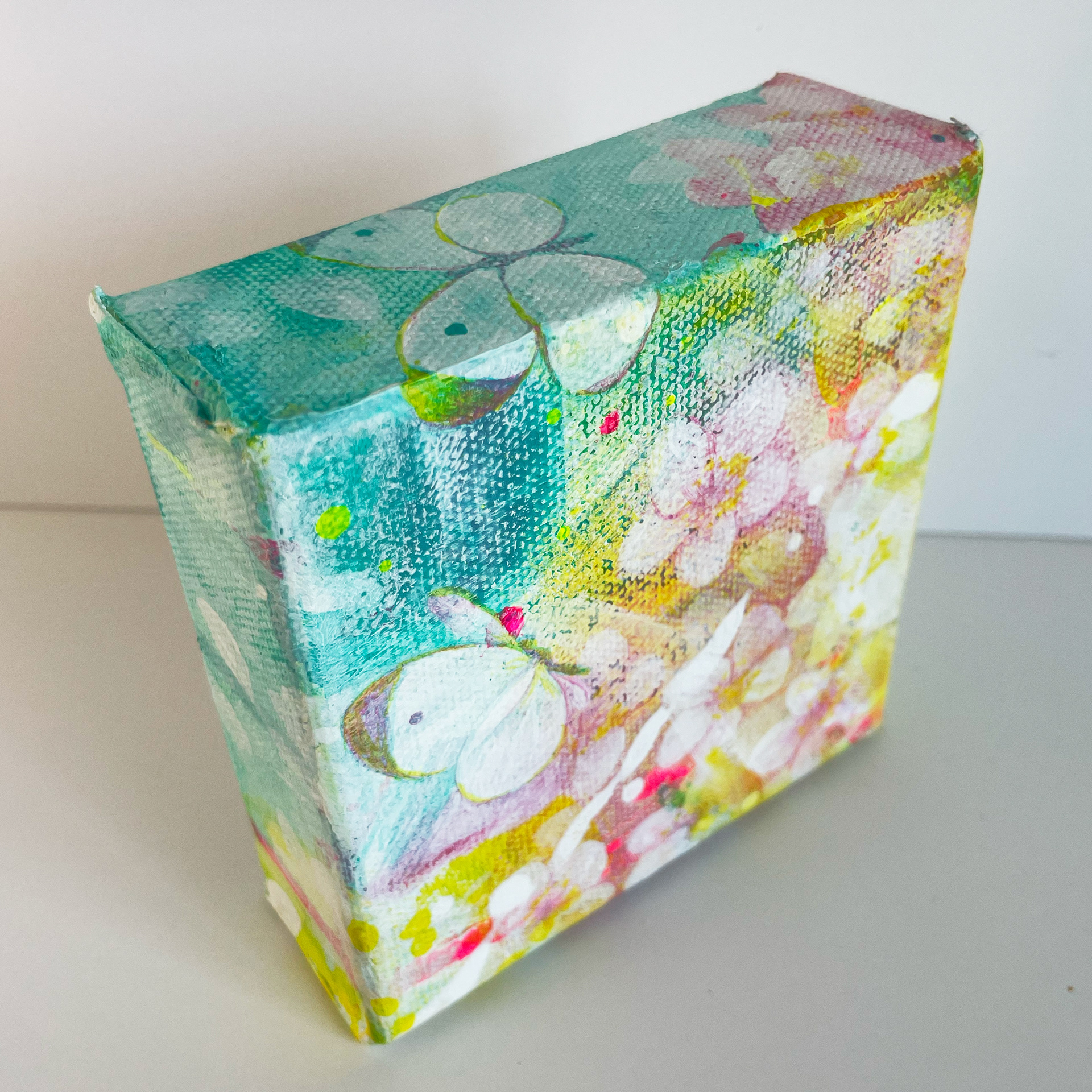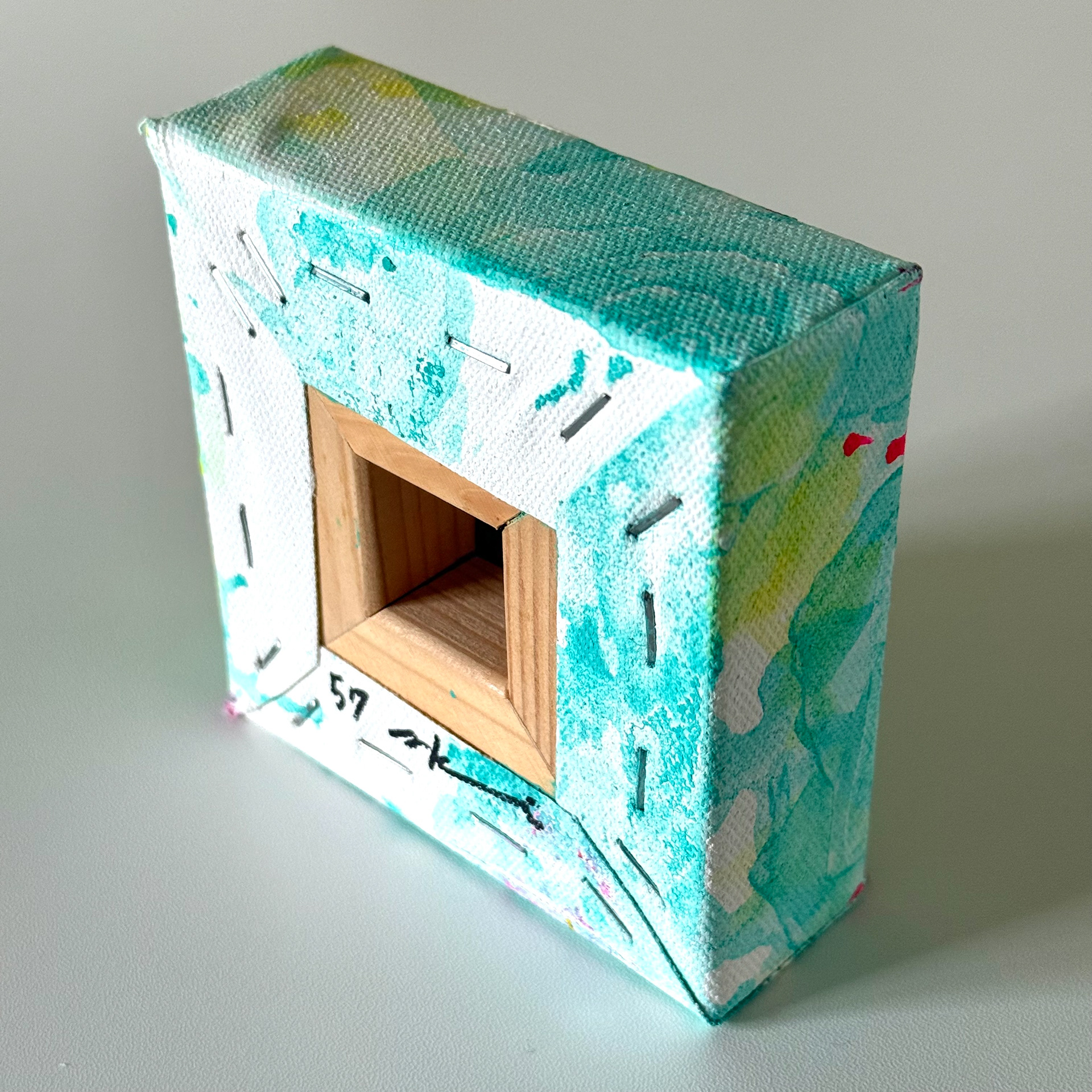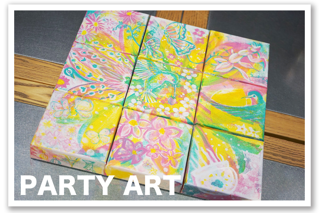 パーティーアートは、小さなキャンバス(張りキャンバス10×10×3cm)を組み合わせ、大きな絵を描く作品です。パーツひとつひとつに全て違う物語が描かれ、完成されたひとつの作品となっており、バラバラになってもそれぞれの魅力を失わないように描かれています。